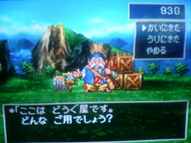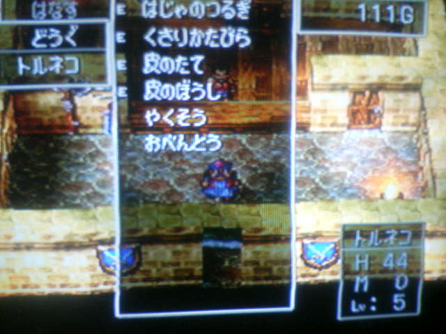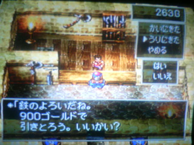 この章では旅商人や旅の宿屋などが出てきます。戦闘かと思ったら曲が違うので最初にあうと音楽が違くてビビります。ここで魔物の落とした物を売却します。鉄の鎧や鉄の槍・・・・・・